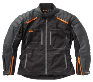 KTM-Adventure ajotakki, hengittävä, tuulen ja vedenpitävä, SAS-TEC-suojat olka- ja kyynärpäissä, saatavana selkäsuoja.